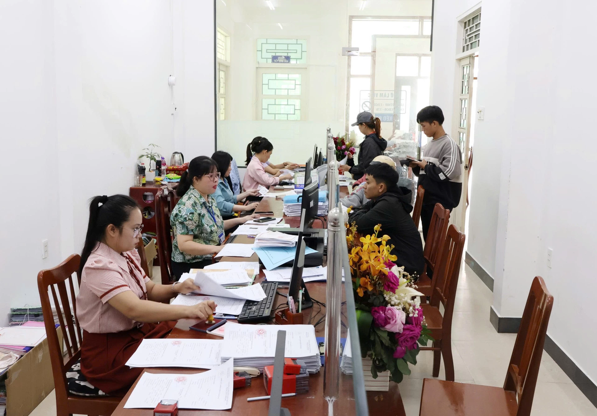 | Người dân thực hiện thủ tục hành chính tại Trung tâm Phục vụ hành chính công phường Đô Vinh. |