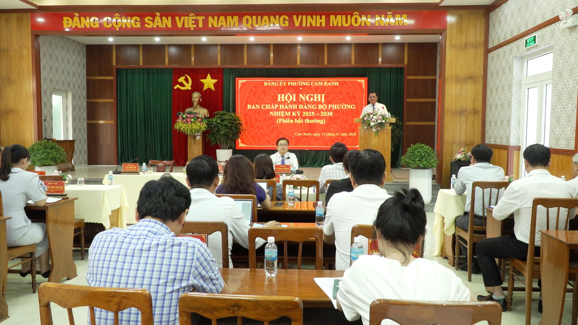 Chiều 15/01/2026, Đảng ủy phường Cam Ranh đã tổ chức Hội nghị Ban Chấp hành Đảng bộ hường phiên bất thường. Các đồng chí: Lê Ngọc Thạch, Bí thư Đảng ủy, Chủ tịch HĐND phường, Cao Nho Trí, Phó bí thư Đảng ủy, Giám đốc Trung tâm chính trị, Lữ Ngọc Trung, Phó Bí thư đảng ủy, Chủ tịch UBND phường đồng chủ trì hội nghị.