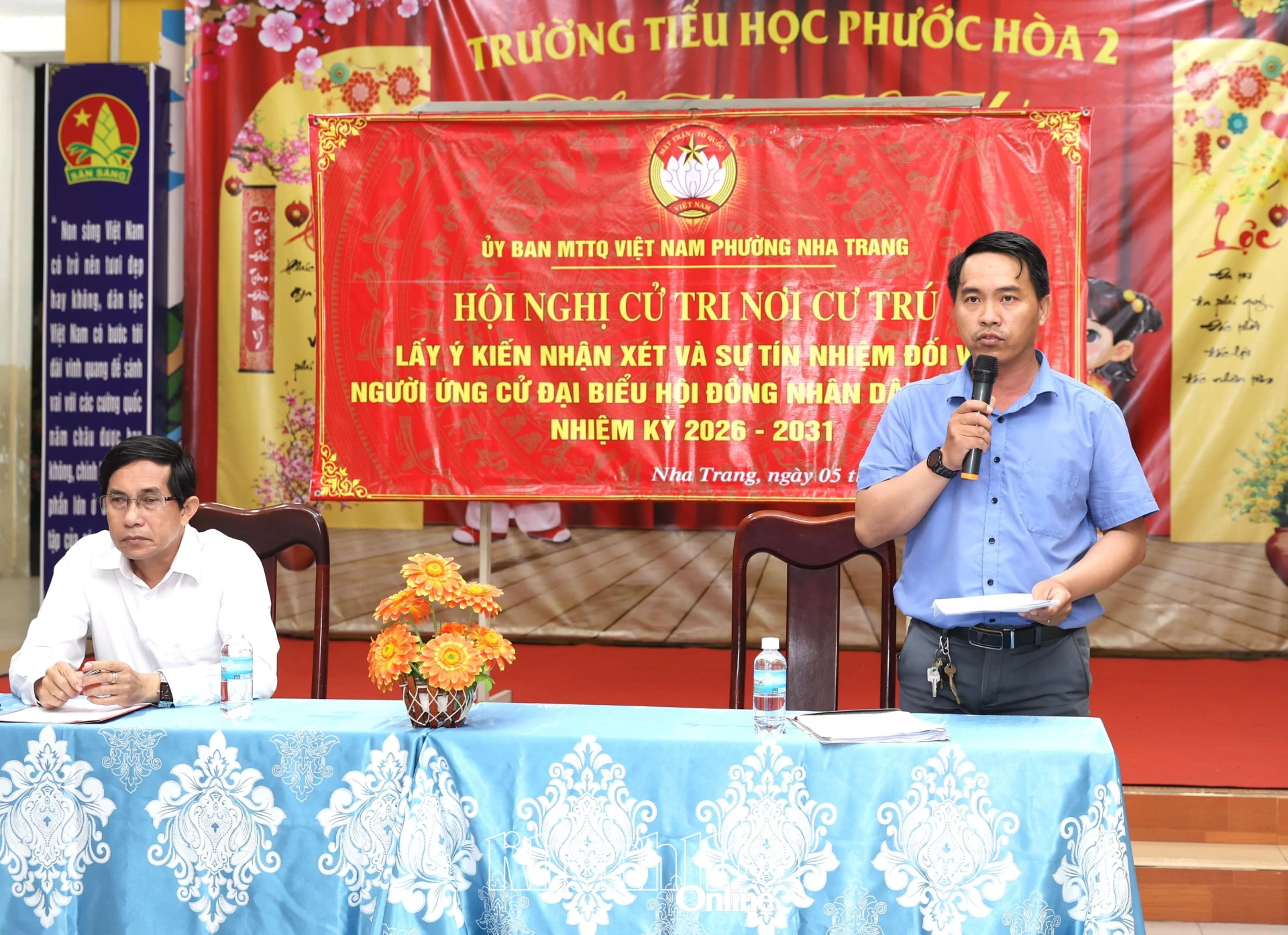 Tại hội nghị, cử tri đã nghe đại diện Ủy ban MTTQ phường Nha Trang báo cáo về tiêu chuẩn của đại biểu HĐND và tóm tắt tiểu sử, quá trình công tác của người ứng cử đại biểu HĐND các cấp nhiệm kỳ 2026 - 2031. Trong 5 người được giới thiệu ứng cử, có đồng chí Trần Hòa Nam - Tỉnh ủy viên, Phó Chủ tịch UBND tỉnh ứng cử đại biểu HĐND tỉnh; 4 người ứng cử đại biểu HĐND phường, xã, bao gồm: ông Trần Việt Trung - Bí thư Đảng ủy, Chủ tịch HĐND phường Tây Nha Trang; ông Huỳnh Ích Trí - Phó Chủ tịch Ủy ban MTTQ Việt Nam kiêm Chủ tich Hội Cựu Chiến binh phường Tây Nha Trang; ông Nguyễn Đình Châu - Phó Trưởng ban Văn hóa - Xã hội HĐND phường Nam Nha Trang; bà Lê Thị Khánh Ngọc - Bí thư Chi đoàn Tổ dân phố Chí Linh, phường Nha Trang.