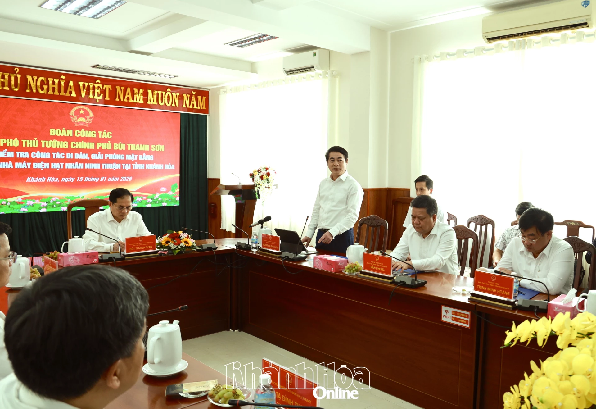 Sáng 15-1, Đoàn công tác của Chính phủ do đồng chí Bùi Thanh Sơn - Ủy viên Trung ương Đảng, Phó Thủ tướng Chính phủ làm Trưởng đoàn có buổi làm việc với tỉnh Khánh Hòa về tình hình triển khai Dự án Nhà máy Điện hạt nhân Ninh Thuận 1 và 2. Tham gia đoàn công tác có đồng chí Nguyễn Thanh Hải - Ủy viên Trung ương Đảng, Ủy viên Ủy ban Thường vụ Quốc hội, Chủ nhiệm Ủy ban Khoa học, Công nghệ và Môi trường; lãnh đạo các bộ, ngành Trung ương. Về phía tỉnh Khánh Hòa có các đồng chí: Nghiêm Xuân Thành - Ủy viên Trung ương Đảng, Bí thư Tỉnh ủy; Trần Phong - Phó Bí thư Tỉnh ủy, Chủ tịch UBND tỉnh; Trịnh Minh Hoàng - Phó Chủ tịch UBND tỉnh, cùng lãnh đạo các sở, ngành, địa phương liên quan.