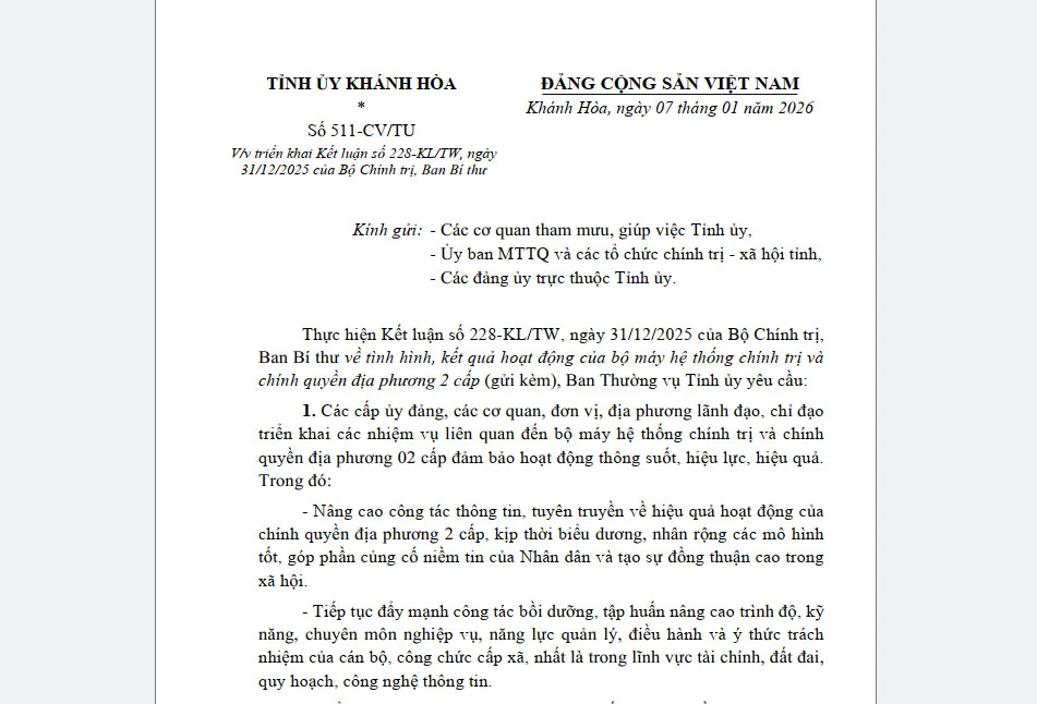 Ban Thường vụ Tỉnh ủy Khánh Hòa vừa ban hành Công văn số 511 về triển khai Kết luận số 228, ngày 31-12-2025 của Bộ Chính trị, Ban Bí thư về tình hình, kết quả hoạt động của bộ máy hệ thống chính trị và chính quyền địa phương 2 cấp.