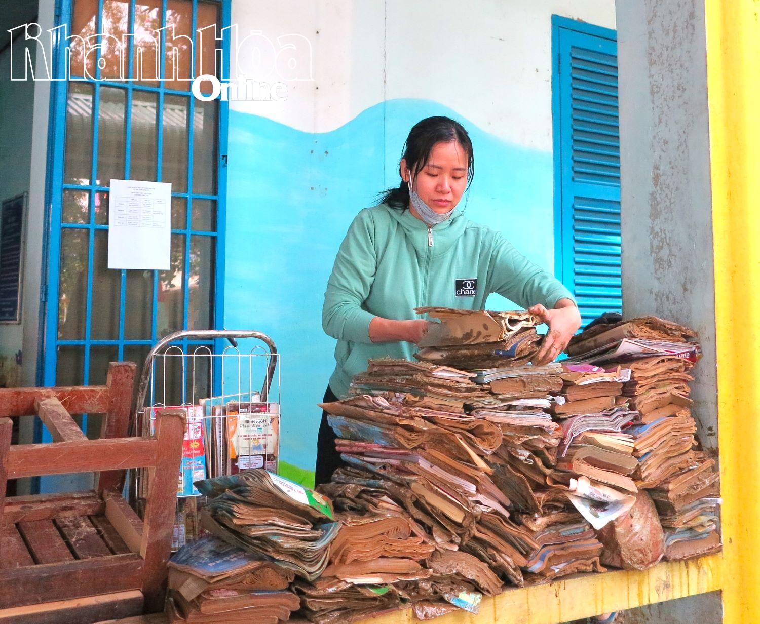 | Nhiều sách vở của học sinh đã bị ướt hỏng do mưa lũ. Trong ảnh: Trường Tiểu học thị trấn Diên Khánh 2 (xã Diên Khánh). |