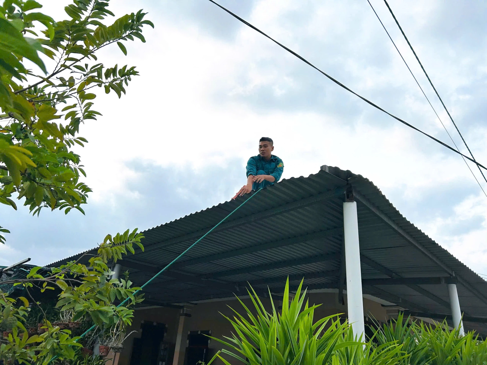 | Lực lượng dân quân phường Đông Ninh Hòa hỗ trợ người dân chằng néo nhà cửa. |