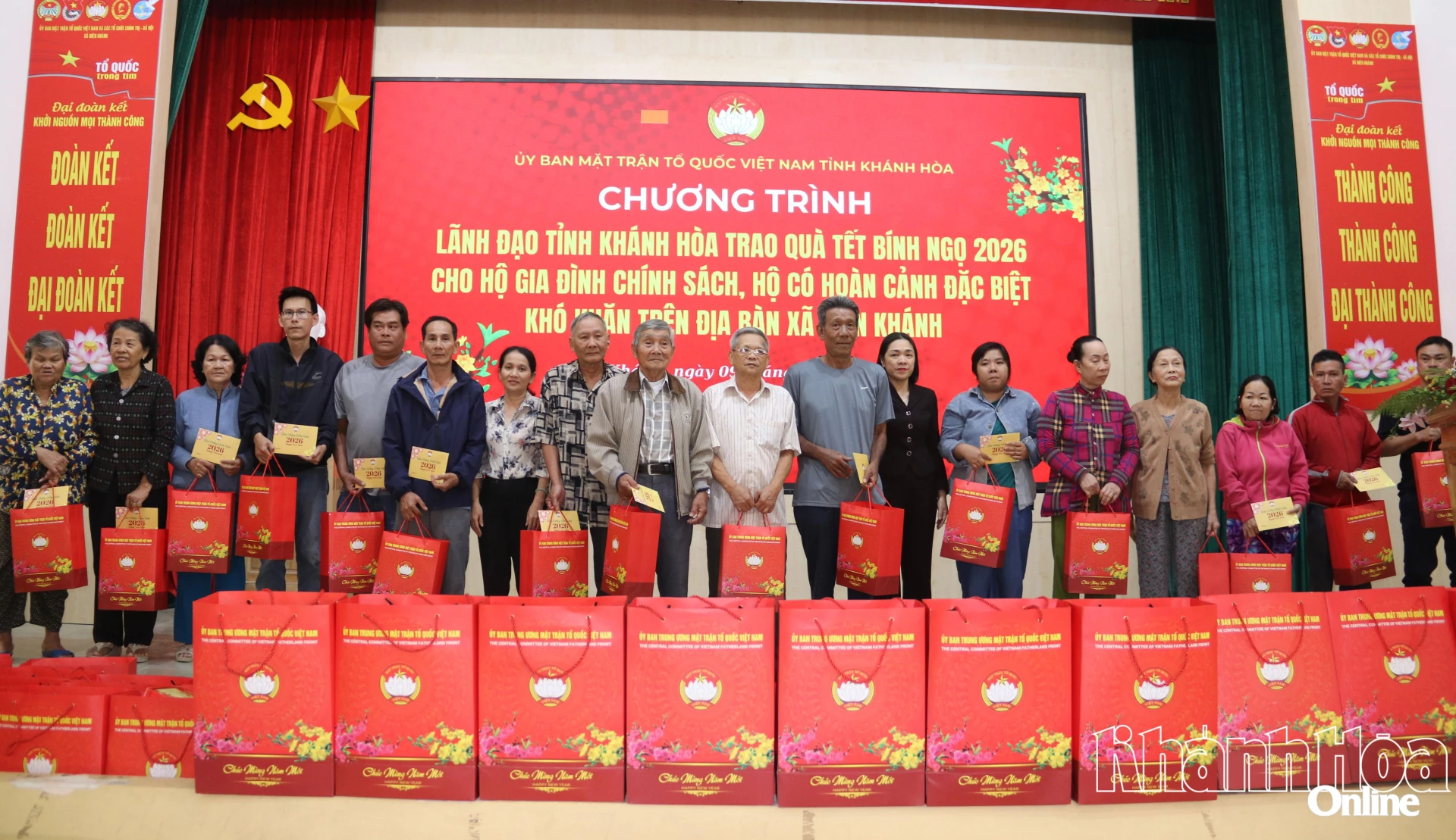 Sáng 9-2, đồng chí Trần Thu Mai - Ủy viên Ban Thường vụ Tỉnh ủy, Phó Chủ tịch Thường trực Ủy ban MTTQ Việt Nam tỉnh Khánh Hòa đến thăm, trao quà Tết Bính Ngọ năm 2026 cho các gia đình chính sách, hộ có hoàn cảnh đặc biệt khó khăn trên địa bàn 2 xã Diên Khánh và Diên Lâm.