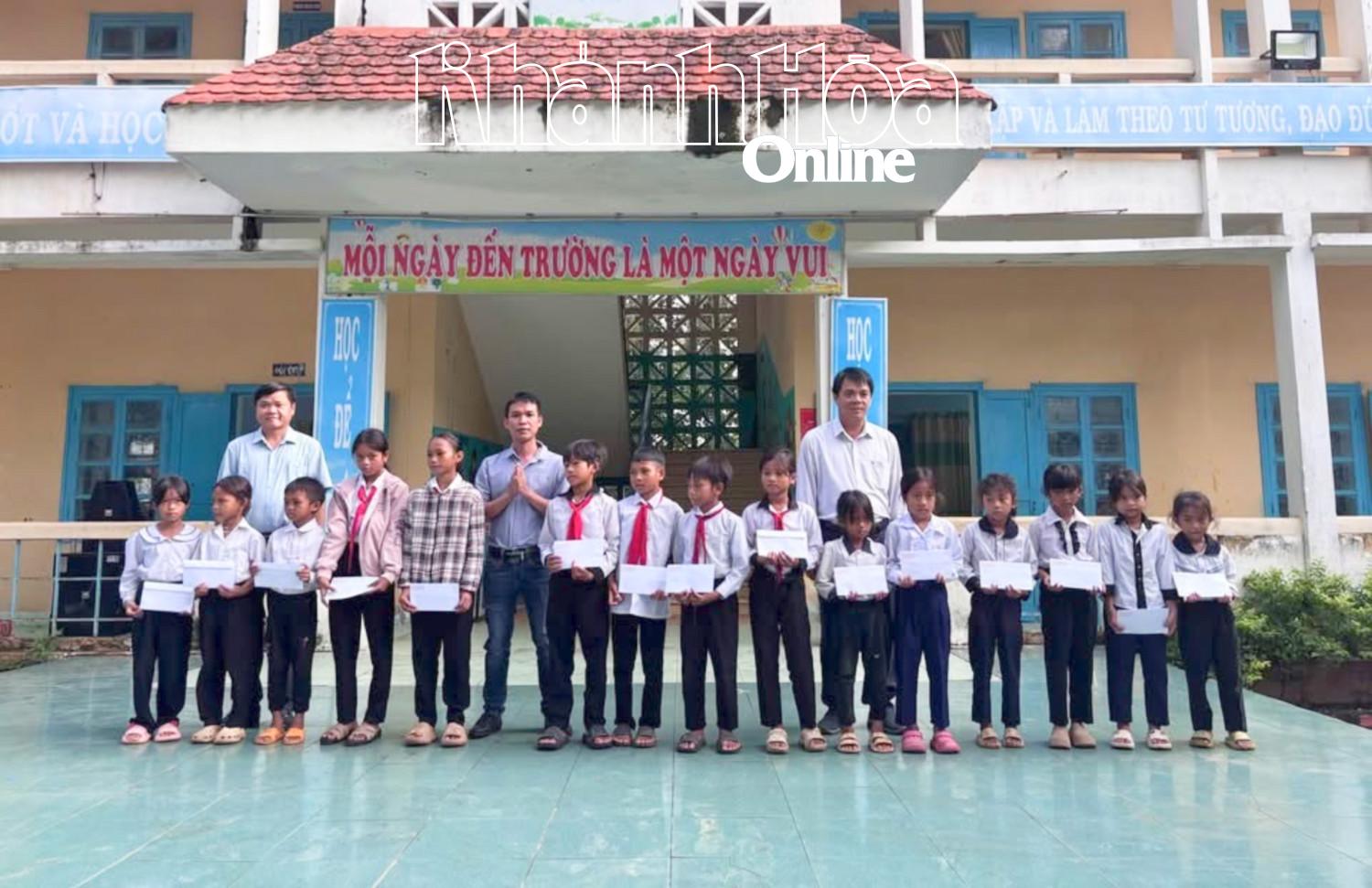| Lãnh đạo UBND xã Anh Dũng trao học bổng cho học sinh tại điểm Trường Tiểu học Ma Nới. |