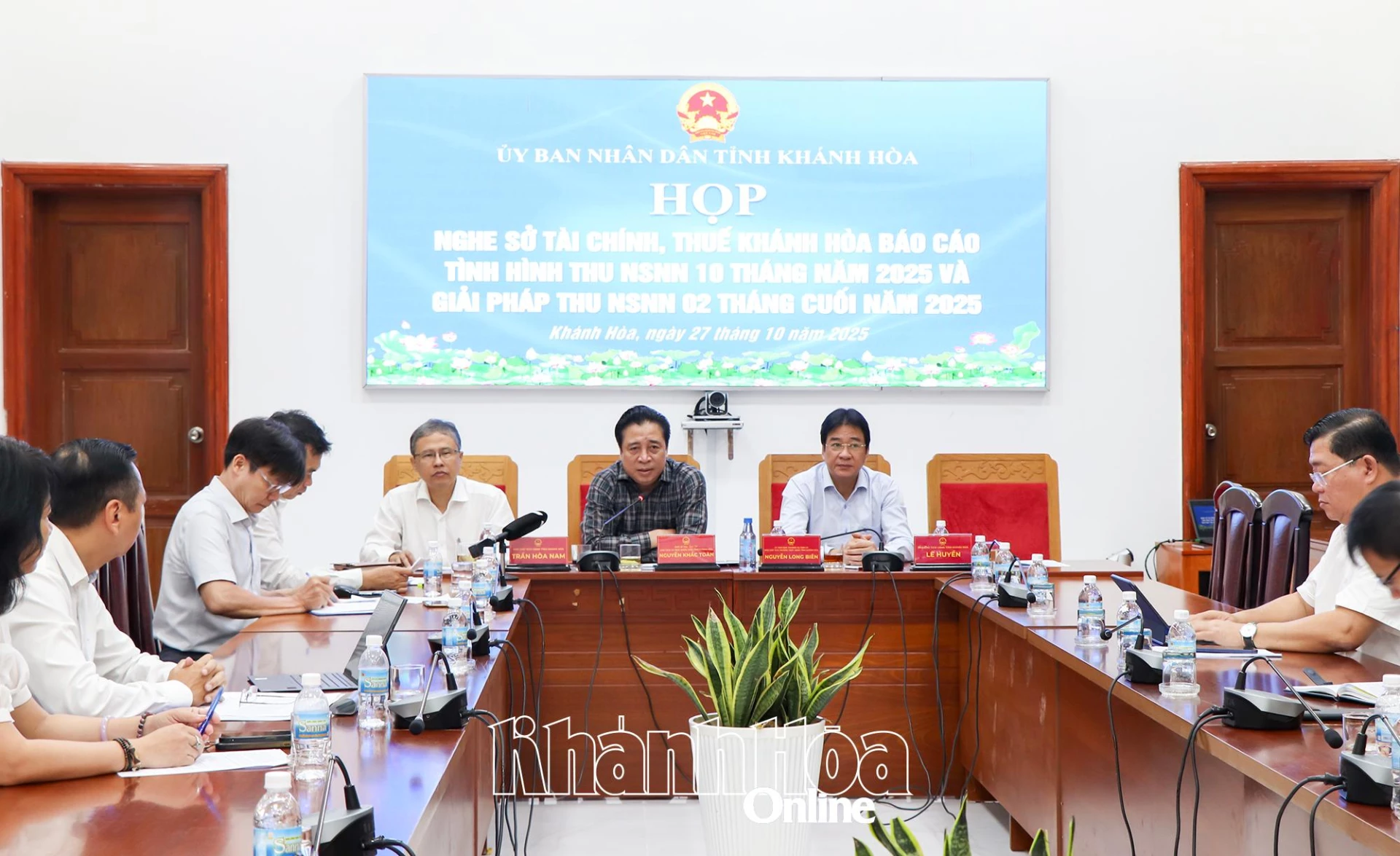 Sáng 27-10, đồng chí Nguyễn Khắc Toàn - Phó Bí thư Tỉnh ủy, Chủ tịch UBND tỉnh Khánh Hòa và các Phó Chủ tịch UBND tỉnh chủ trì cuộc họp nghe Sở Tài chính, Thuế tỉnh báo cáo tình hình thu ngân sách nhà nước (NSNN) 10 tháng và giải pháp thu ngân sách nhà nước 2 tháng cuối năm.